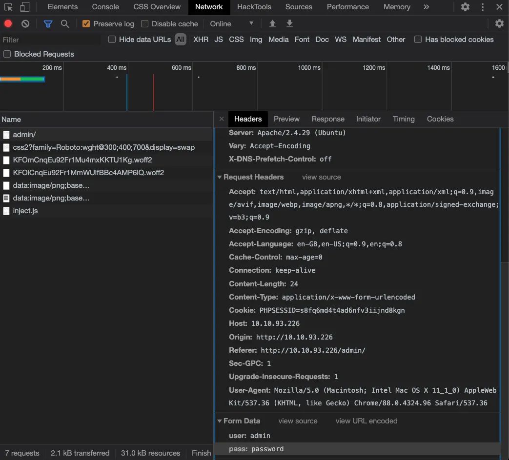 As you can see, there is the user and password in the form data, we can use this to brute-force the login with hydra.